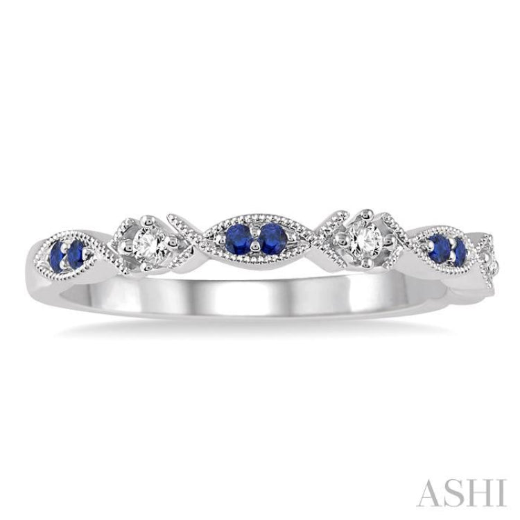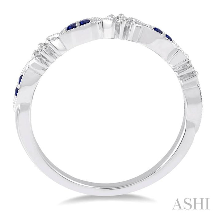 Now you have more reasons to blush. This high polished wedding band is crafted in 14 Karat White Gold and features 11 prong set blue Sapphires and diamonds. With milgrain detailing, this gemstone wedding band is a true reflection of pure promise of together forever. Total diamond weight is 1/20 Ctw and blue Sapphire measures 1.25 MM.