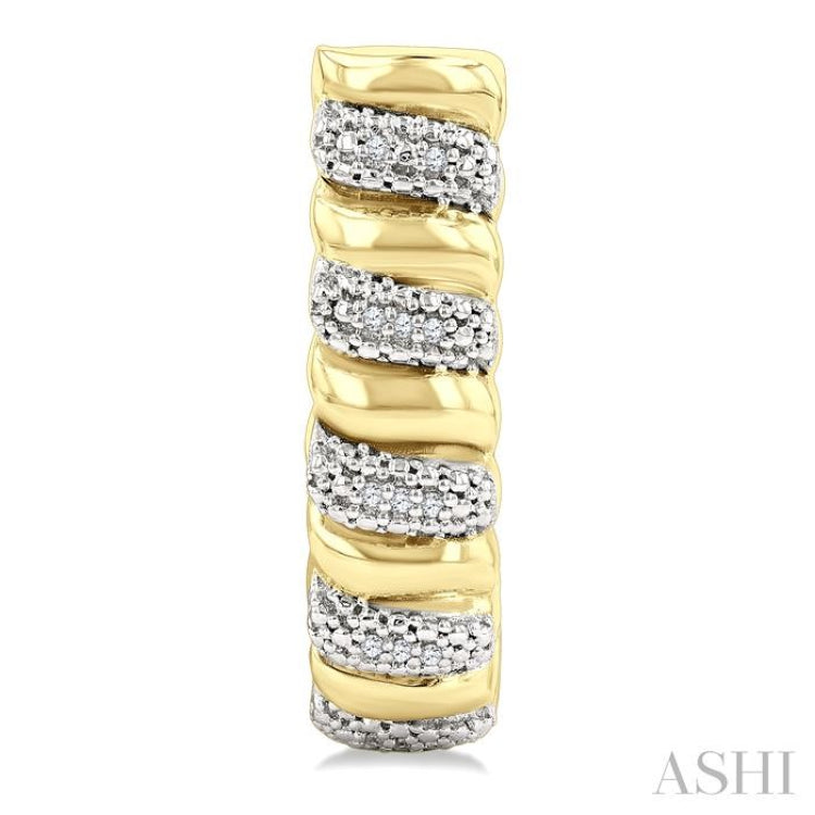 Bring a modern twist to your look with these bold diamond fashion half hoop earrings, featuring a ribbed design that alternates smooth 24kt Yellow Gold Vermeil ribs with sleek silver-accent diamond-embellished ribs. A total of 32 pave set round cut diamonds sparkle across the silver ribs, creating a striking contrast. The diamond fashion half hoop earrings secure with a push-back earnut clasp and are styled in 24kt Yellow Gold Vermeil. Total diamond weight is 1/10 Ctw.