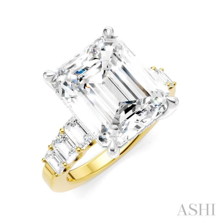 Make your proposal unforgettable with this stunning semi-mount diamond engagement ring that captures the essence of romance and sophistication. What sets it apart is its versatility and personalization, with the option to choose your desired center stone, tailored to match your individual style and preferences. It features a prong-raised emerald center mount, where a center stone of your choice, a emerald cut diamond ranging 4.50 Ctw to 5.50 Ctw, is placed. Adding glamour and sparkle are 6 dazzling pre-installed emerald cut diamonds, flanking the center stone, from along the shank. There is a fancy set 1/4 Ctw emerald cut diamond, followed by a 1/5 Ctw, and a 1/8 Ctw emerald cut diamond on either side of the shank. 20 microscopic split prong set round cut diamonds illuminate the gallery region. The semi-mount engagement ring is styled in a rhodium finish 14 karat yellow and white gold. The total diamond weight is 1 1/4 Ctw.